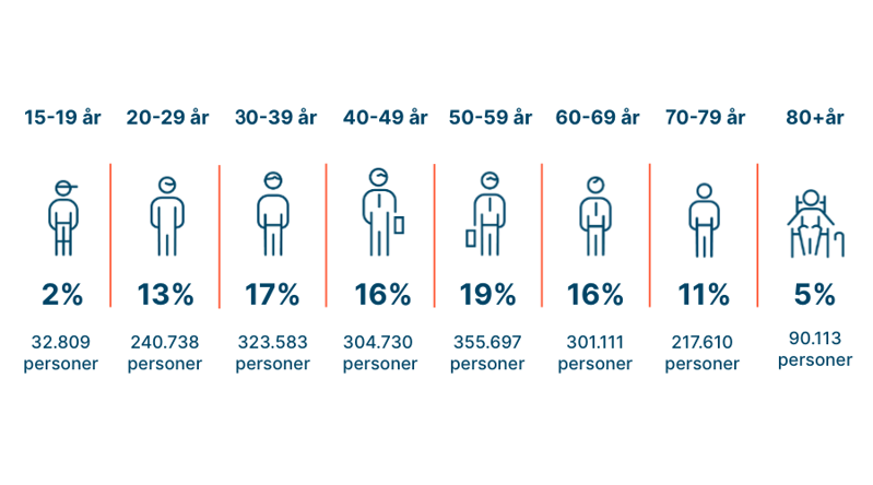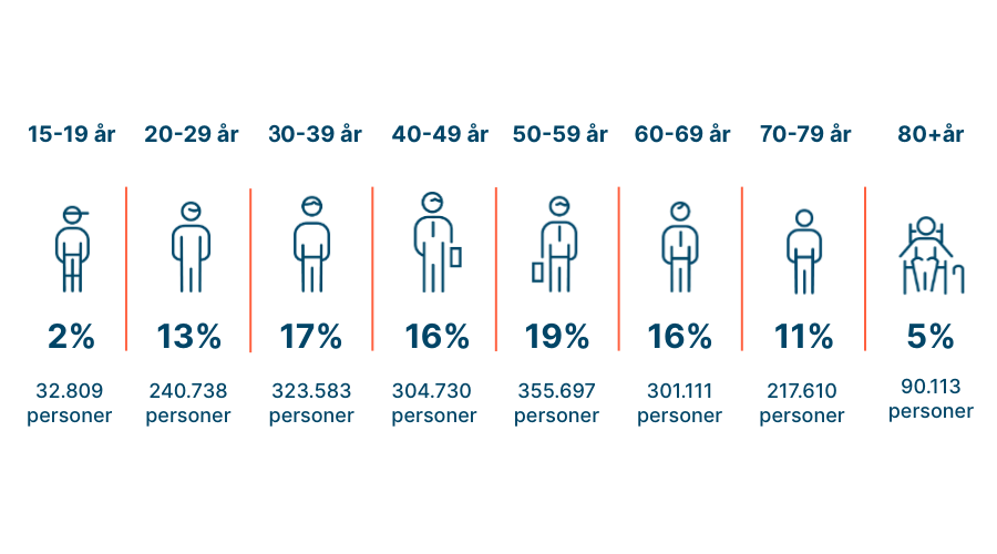 Figuren viser personer i Organdonorregistret fordelt på otte aldersgrupper. Derudover viser figuren, hvor stor en procentdel de enkelte aldersgrupper udgør af det samlede antal registrerede i Organdonorregisteret.