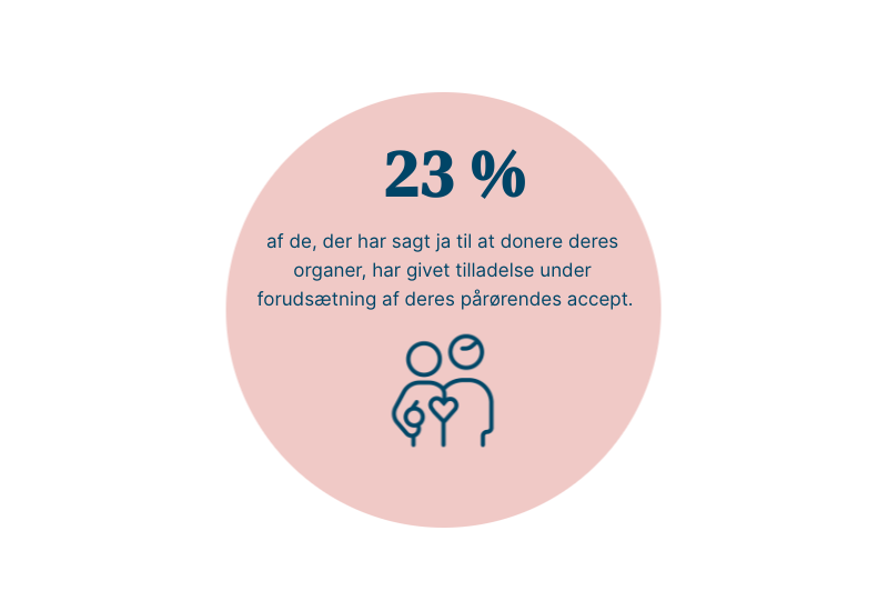 Når man registrerer sin beslutning i Organdonorregistret, har man mulighed for at give sine nærmeste det sidste ord. I figuren fremgår det, hvor stor en andel af de, der har sagt ja til at donere nogle eller alle deres organer, forudsætter, at det skal være under ”pårørendes accept”.