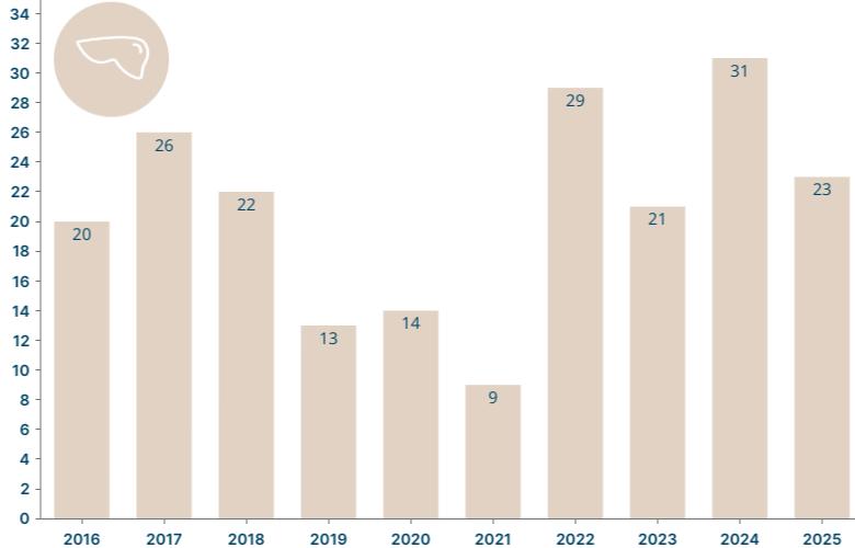- 23 patienter stod på venteliste til en lever ved udgangen af 2025.