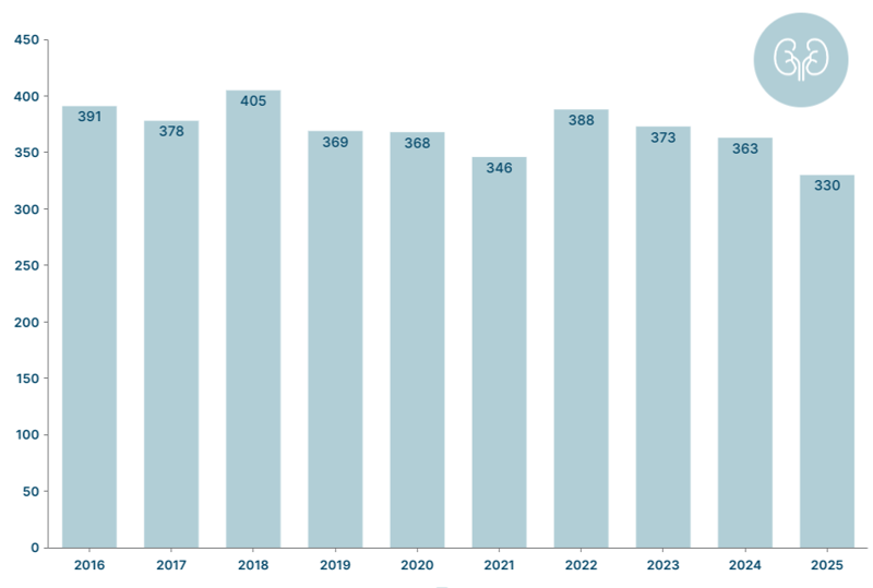 - 330 patienter stod på venteliste til en nyre ved udgangen af 2025.