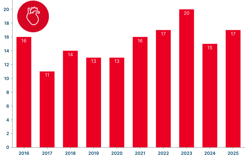 - 17 patienter stod på venteliste til et hjerte ved udgangen af 2025.
