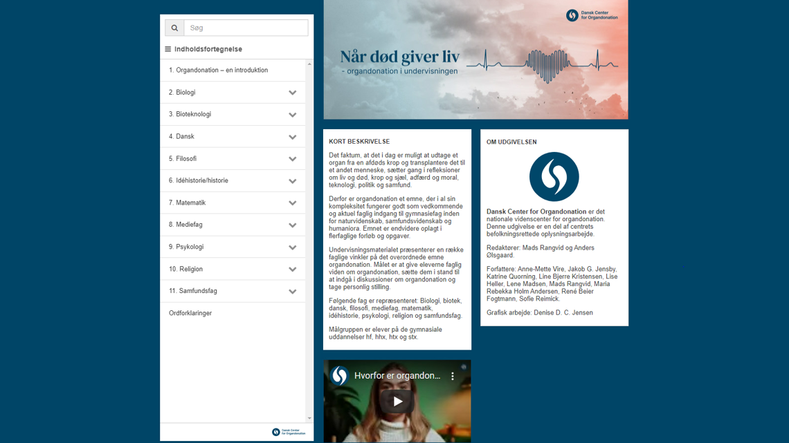 Med undervisningsmaterialet 'Når død giver liv – organdonation i undervisningen' vil Dansk Center for Organdonation nå de unge på de gymnasiale uddannelser gennem den daglige undervisning. Organdonation er et emne, der sætter gang i refleksioner om liv og død, krop og sjæl, politik, teknologi og samfund. Derfor egner emnet sig godt til mange fag i gymnasierne.
