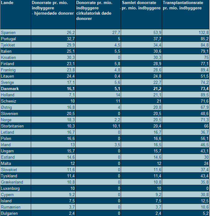Tabellen viser donations- og transplantationsraten pr. mio. indbyggere fordelt pr. land.
