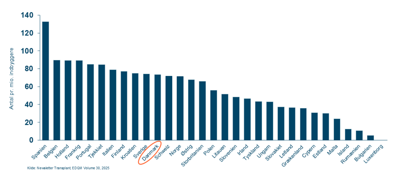 Tallene i grafikken nedenfor viser transplantationsraten pr. mio. indbyggere i de enkelte lande. I transplantationsraten indgår organer fra både levende og afdøde donorer.