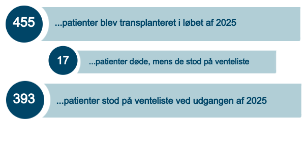 Oversigten viser antal patienter på venteliste til et organ og antallet af transplanterede i 2025.